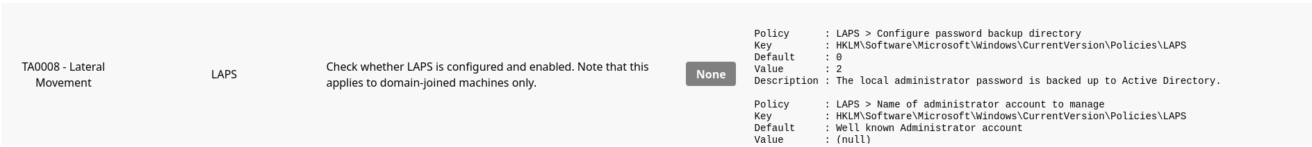Alternatively, tools like PrivEscCheck will automatically enumerate if LAPS is installed/enabled, and fetch useful information about its configuration.
